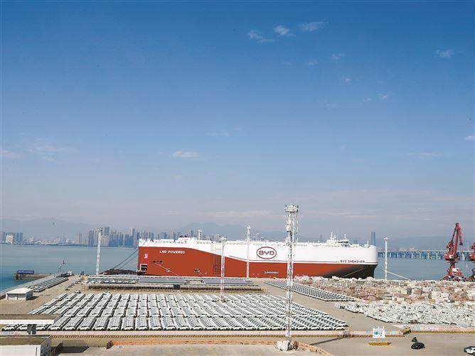 24日,在厦门海关所属东渡海关监管下,1768辆比亚迪新能源汽车搭乘企业自营滚装船“深圳号”,从厦门现代码头起航,驶向墨西哥。这是“深圳号”首航厦门。