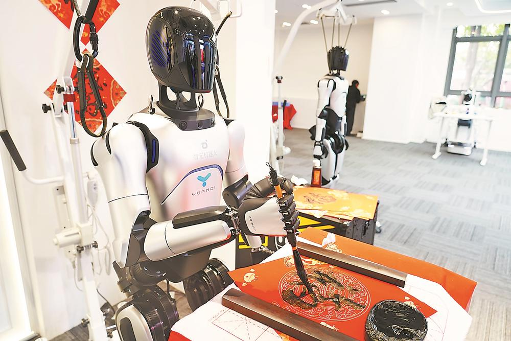 在元启创新机器人展示中心里,“远征”在写“福”字。见习记者吴函晓 摄