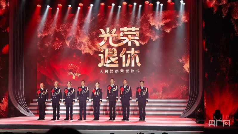洪交撬等人代表退休民警走上舞台,接受全场致敬(央广网记者 邬眉 摄)