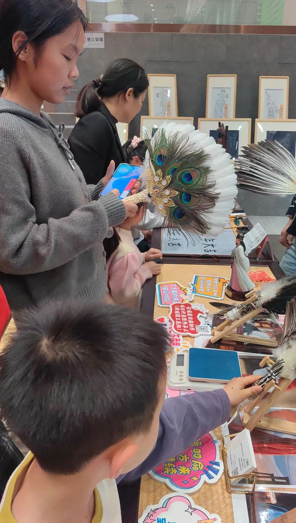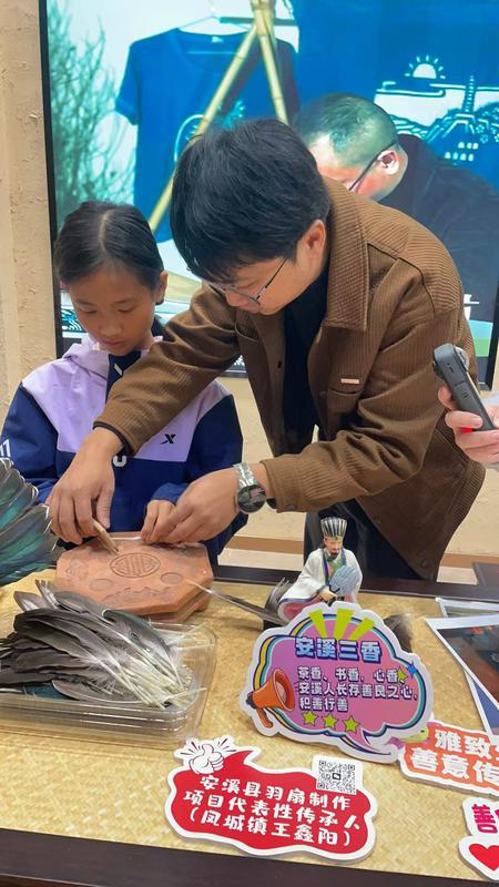 与此同时,安溪非物质文化遗产长廊里竹藤编、彩扎、剪纸等十多项非遗项目同步开展。在非遗羽扇制作展位前,一根根精挑细选的羽毛在羽扇制作师傅王鑫阳的指尖穿梭,匀整无瑕的羽毛在他手中渐渐聚拢成一把轻盈优雅的羽扇。“以前担心这门手艺会失传,但现在越来越多年轻人带着孩子来体验,让我看到了希望。”王鑫阳欣慰地说。