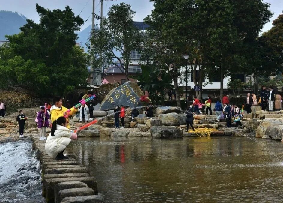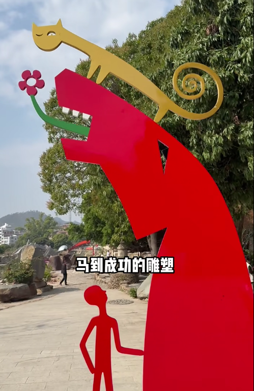 在金谷溪岸文艺村,溪水潺潺、文艺气息浓郁,乡村游、亲子游热度高涨。特色市集、亲水体验、文艺展演轮番上演,吸引众多外地游客与返乡侨亲前来体验,艺术家陈文令打造的“与猫共舞,马到成功”雕塑为乡村注入灵动艺术气息;新落成的关公文化馆采用榫卯结构,藤蔓窗棂、石砌算盘透出生机勃勃的野生力量与乡土趣味。文艺村融中国传统山水画“三远法”造园,建成“岸上有岸、路中有路”的立体园林,一步一景。春节期间举办的关公艺术展让农民看得懂、接地气,艺术真正扎根乡土,为新春文旅增添别样魅力。