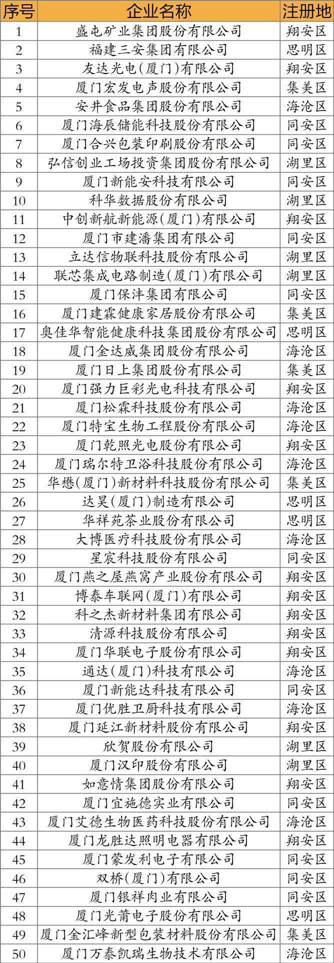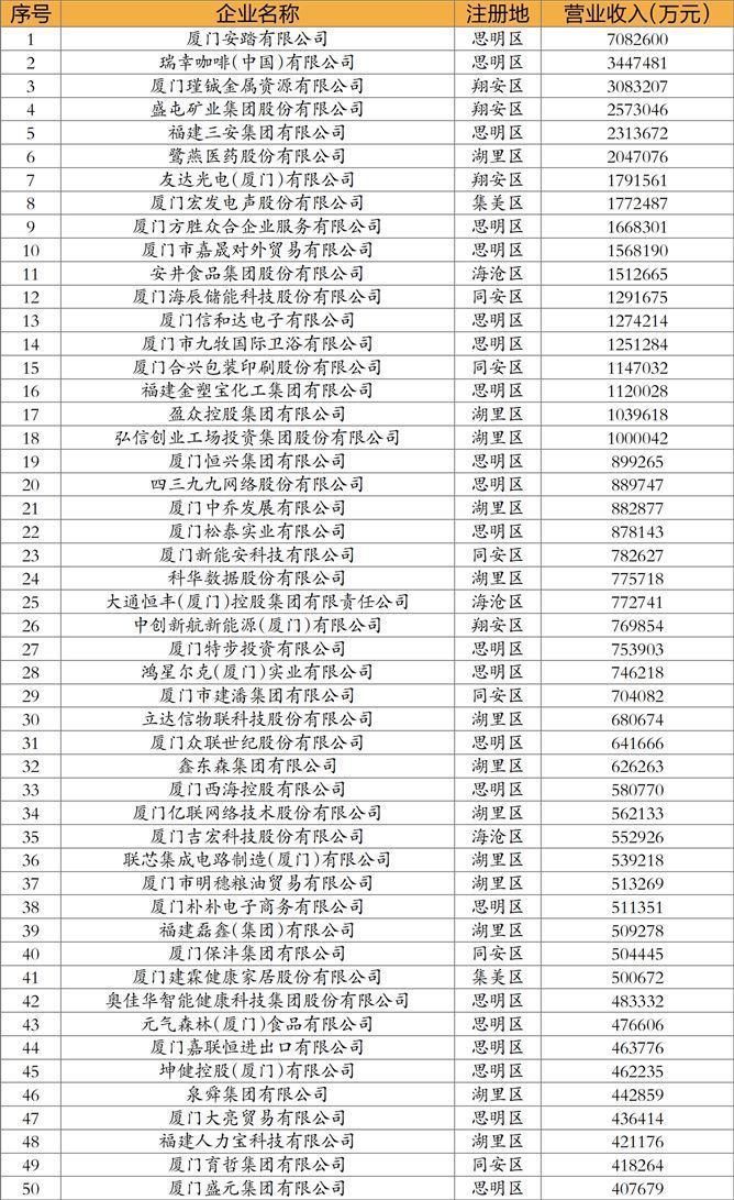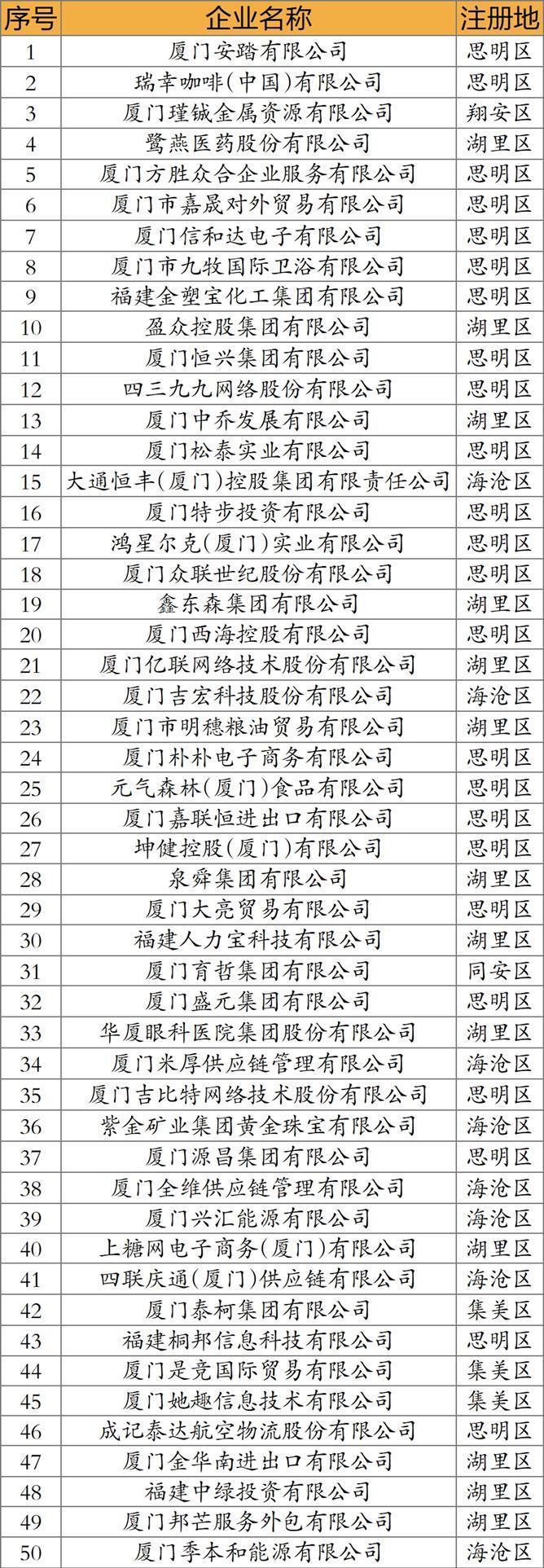 同时出炉的还有“制造业50强”,盛屯矿业集团股份有限公司位居榜首;“服务业50强”,厦门安踏有限公司位居榜首;“科技创新50强”,厦门市九牧国际卫浴有限公司位居榜首。和去年不同的是,今年三个子榜单的“阵容”都从20强扩容到50强。